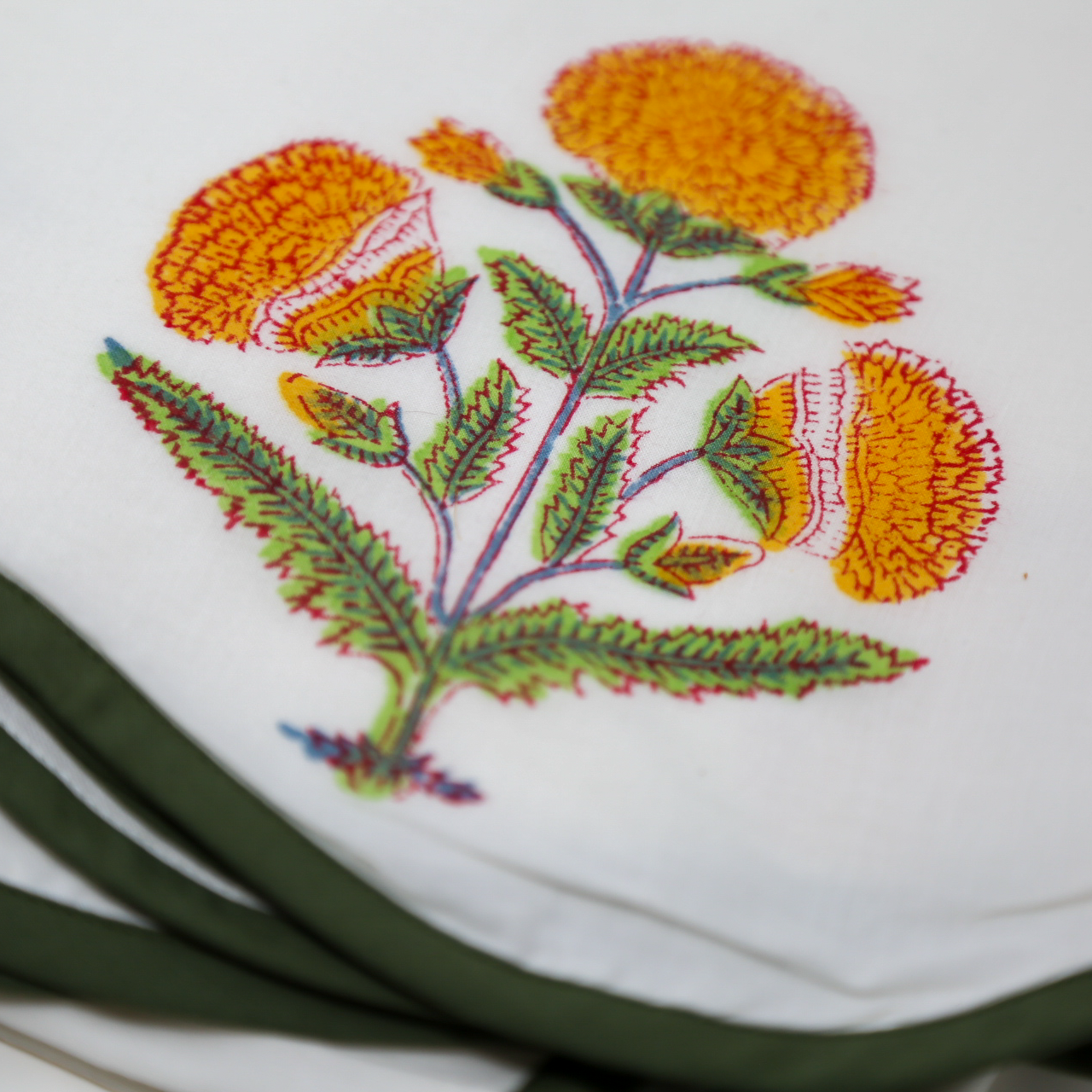 Up your game with our charming scalloped block printed table toppers. Mix and match patterns for a winning look.