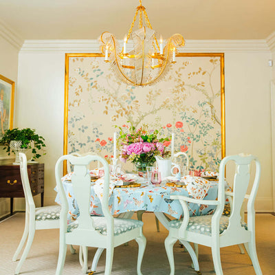 Inslee Claiborne Linen Tablecloth | The Claiborne linen block print tablecloth features Inslee Fariss’s hand-painted blue blossoms and vines on crisp white—effortless, elegant, and summer-ready.