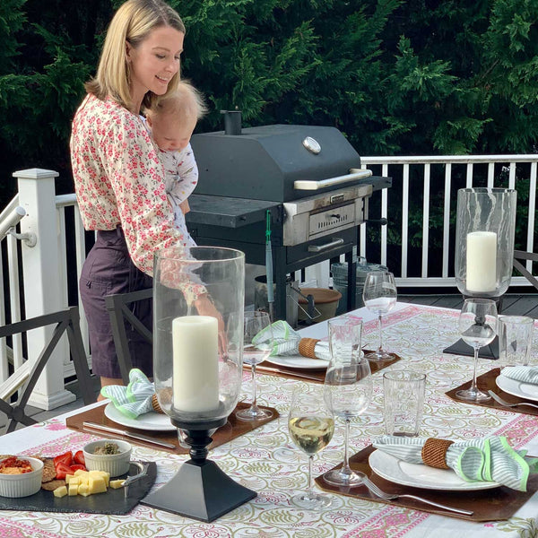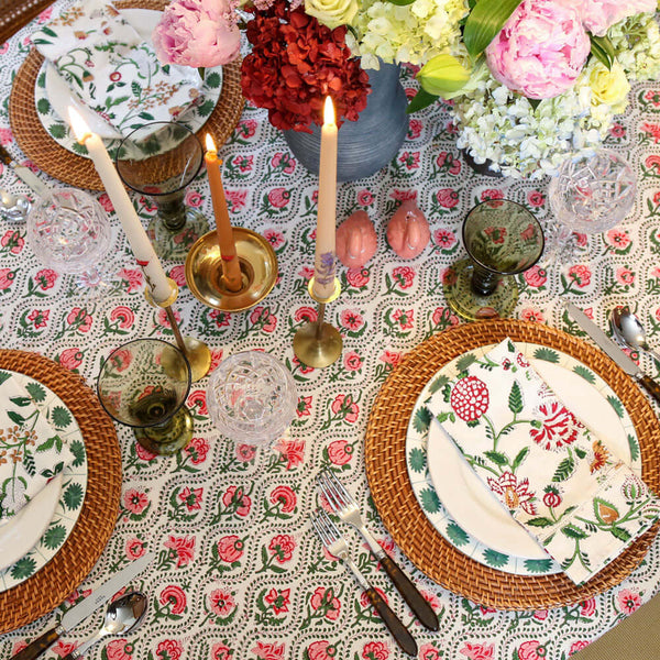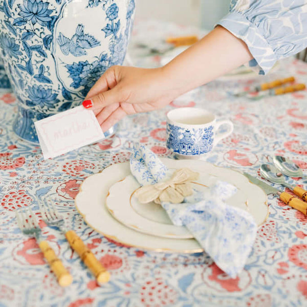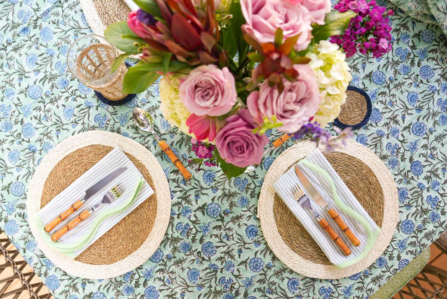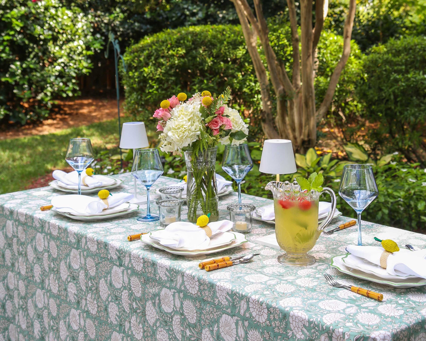Don’t be afraid to mix patterns like our Brandywine Napkins + Evergreen Times Tablecloth. Once you break up the patterns with your placemats and plates, it won’t feel busy. A good rule of thumb is to have your larger print as the base and layer smaller prints on top.
