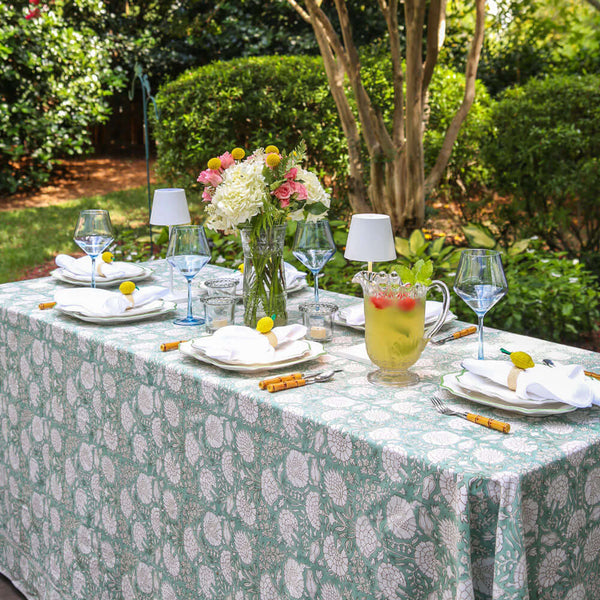 Our Sage Fandango Tablecloth is a perfect base for big, unkempt arrangements.